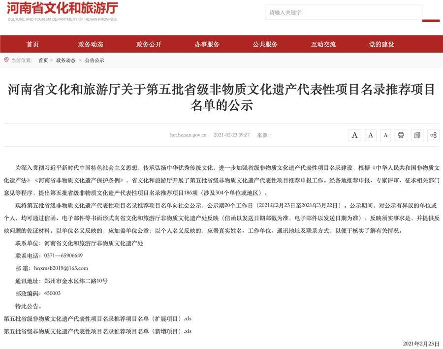 本网讯 日前,记者从河南省文化和旅游厅官网查询到,第五批省级非物质文化遗产代表性项目名录推荐项目名单正在公示,公示期20个工作日(2021年2月23日至2021年3月22日)。省文化和旅游厅开展了第五批省级非物质文化遗产代表性项目推荐申报工作。经各地推荐申报、专家评审、征求相关部门意见等程序,提出第五批省级非物质文化遗产代表性项目名录推荐项目186项(涉及304个单位或地区)。