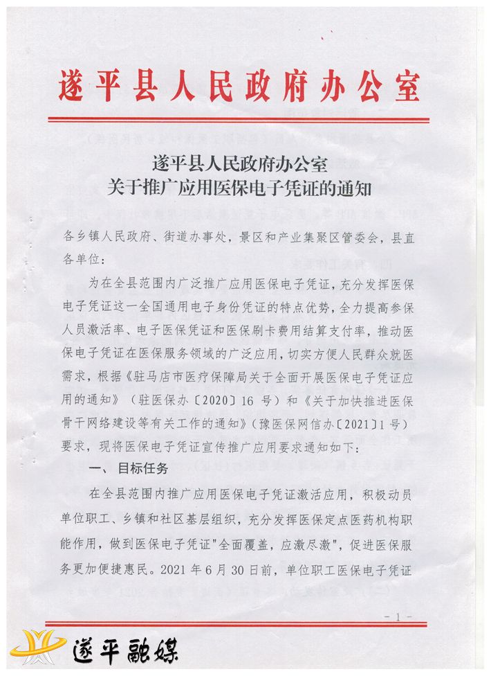 遂平县人民政府办公室关于推广应用医保电子凭证的通知