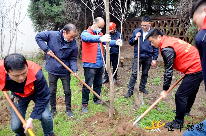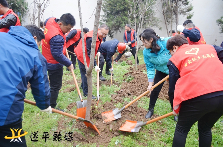 植树场地,气氛热烈,欢声笑语身穿红马甲的志愿者们手握铁锹,自由组合,分苗、整地,挖坑,扶苗,填土踏实,一丝不苟,配合默契。干劲十足,在红色的宣传横幅印衬下,一株株代表着生机活力和美好祝愿的小树苗被小心翼翼植入地下,显得生机勃勃。近一小时内,共种植木兰花、樱花树60余棵。