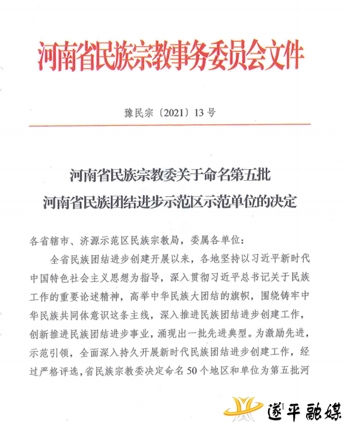 本网讯(通讯员:刘梦茹)近日,河南省民族宗教事务委员会印发了《河南省民族宗教委关于命名第五批河南省民族团结进步示范区示范单位的决定》,经过省民族宗教委严格评选,决定命名遂平县石寨铺镇为第五批河南省民族团结进步示范单位。