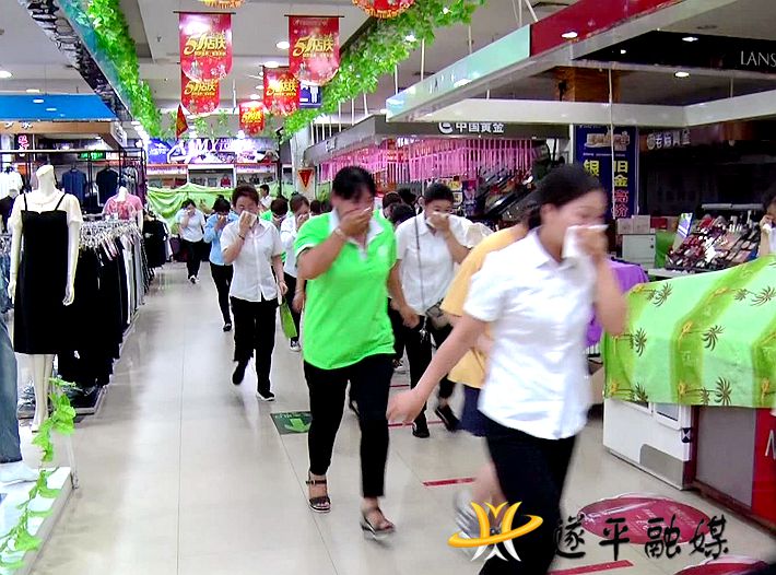 当超市报警系统响起警报后,全体员工快速展开应急疏散,用手绢、毛巾捂住口鼻,在引导员的带领下依次从楼梯有序撤离。同时,消防救援人员赶到“火灾”现场,迅速扑灭大“火”。3分钟后,400余员工顺利疏散至安全区域,演练圆满结束。