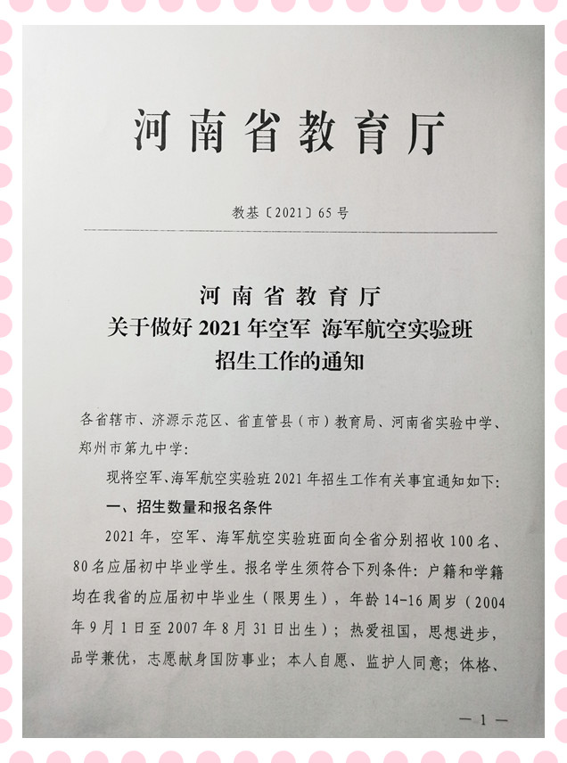 空军青少年航空学校依托河南省实验中学开办航空实验班,旨在为空军输送优秀人才。2021年面向全省招收100名成绩优秀、身体素质合格的应届初中毕业生。高星照同学经过两次体检,三次政审后被顺利录取。这是自2015年空军青少年航空学校招生以来,遂平县首位被录取的学生。