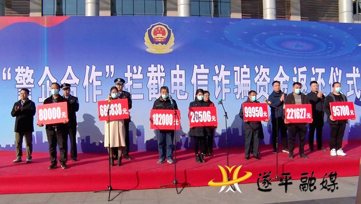 本网讯(记者:莉莉 若愚)为贯彻落实习近平总书记关于打击治理电信网络诈骗犯罪的重要指示批示精神,深入推进打击治理电信网络诈骗违法犯罪专项行动,切实回应社会关切,保障群众合法权益,11月25日下午,河南省公安厅、中国人民银行郑州中心支行、驻马店市公安局、遂平县公安局、蚂蚁集团在遂平县联合举行“警企合作”拦截电信诈骗资金返还仪式。河南省公安厅反诈总队副总队长曹玖青、中国人民银行郑州中心支行副处长刘英、驻马店市公安局党委副书记、常务副局长杜玉坤、县委常委、县委政法委书记王月红、县政府副县长、县公安局局长冯全敬出席返还仪式。