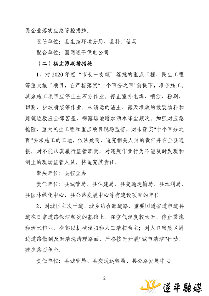 1、对 2020 年经“市长一支笔”签批的重点工程、民生工程等重大施工项目,在严格落实“十个百分之百”前提下,准予施工。其余施工项目应停止土石方作业。停止室外电焊、喷涂、粉刷、切割、护坡喷浆等作业。未清运的渣土、露天堆放的散装物料和建筑垃圾应全部苫盖,裸露场地增加洒水降尘频次。加强对应急抢险、重大民生工程和重点项目现场监督,对未落实“十个百分之百”要求施工的工地,依法处罚,追究相关人员的责任并在全县通报。对不能认真履行监管职责,对违规作业行为不能及时发现和制止的现场监管人员,将追究其责任。