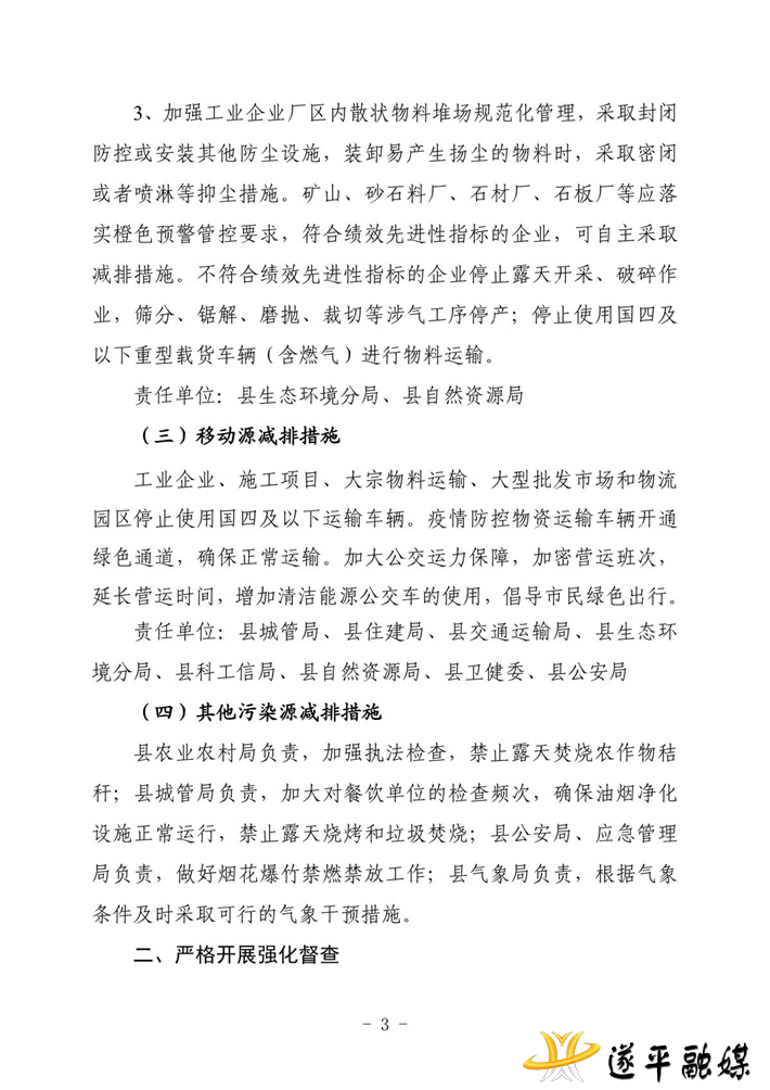 县农业农村局负责,加强执法检查,禁止露天焚烧农作物秸秆;县城管局负责,加大对餐饮单位的检查频次,确保油烟净化设施正常运行,禁止露天烧烤和垃圾焚烧;县公安局、应急管理局负责,做好烟花爆竹禁燃禁放工作;县气象局负责,根据气象条件及时采取可行的气象干预措施。