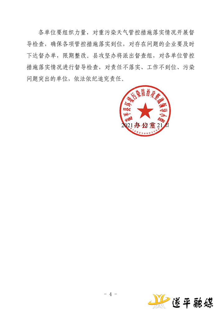 各单位要组织力量,对重污染天气管控措施落实情况开展督导检查,确保各项管控措施落实到位,对存在问题的企业要及时下达督办单,限期整改。县攻坚办将派出督查组,对各单位管控措施落实情况进行督导检查,对责任不落实、工作不到位、污染问题突出的单位,依法依纪追究责任。