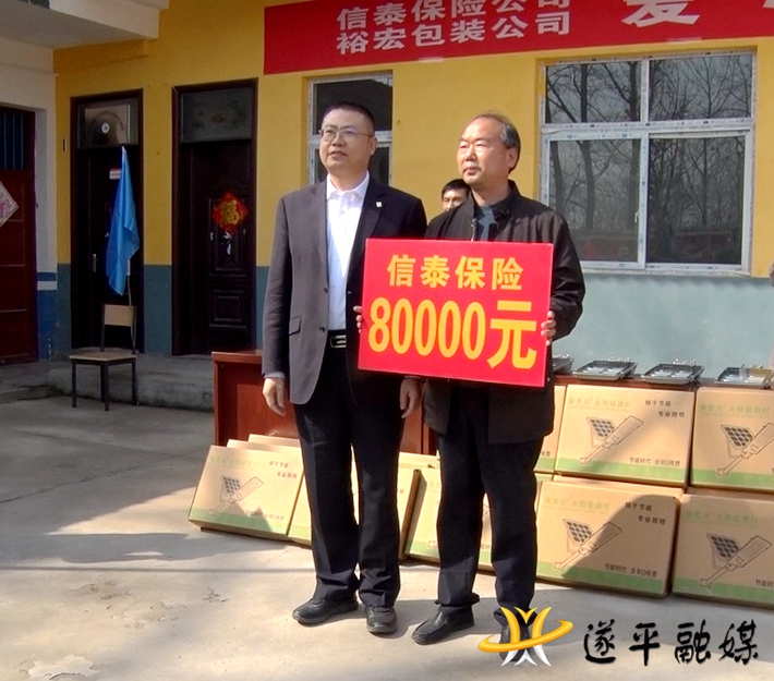 捐赠仪式上,信泰人寿保险河南分公司向县红十字会捐赠80000元,裕宏新型环保包装有限公司向苏庄村捐赠10000元。