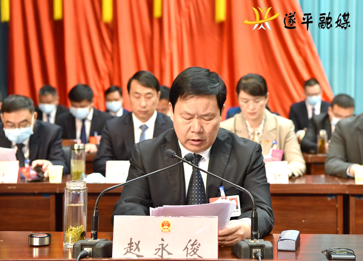 新当选的县人大常委会主任赵永俊发表讲话。他说,会议期间,各位代表以高度的政治自觉、强烈的使命担当,认真履行宪法和法律赋予的职责,共商改革发展大计,共谋遂平发展良策,认真听取和审议通过了《政府工作报告》等6个报告,表决通过了相关决议。大会选举产生了新一届县人大常委会组成人员、县政府领导班子、县法院院长、县检察院检察长,圆满完成了换届选举任务。大会开得很成功,是一次民主、团结、求实、奋进的大会,是一次高举旗帜、维护核心、凝心聚力、共谋发展的大会。