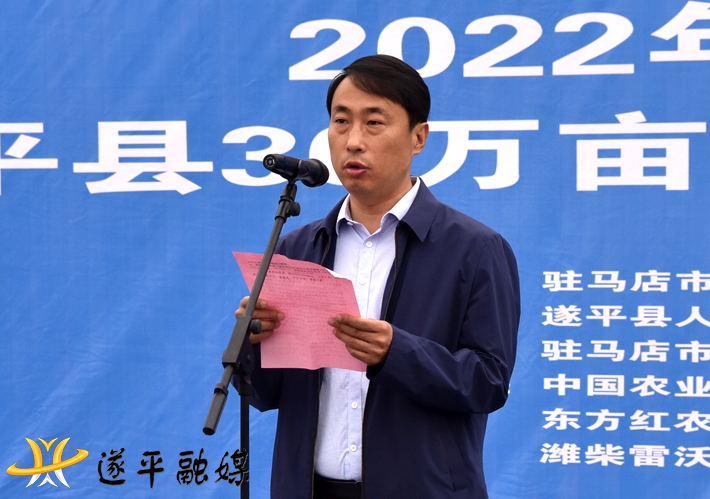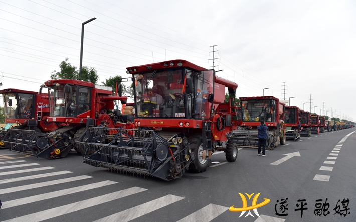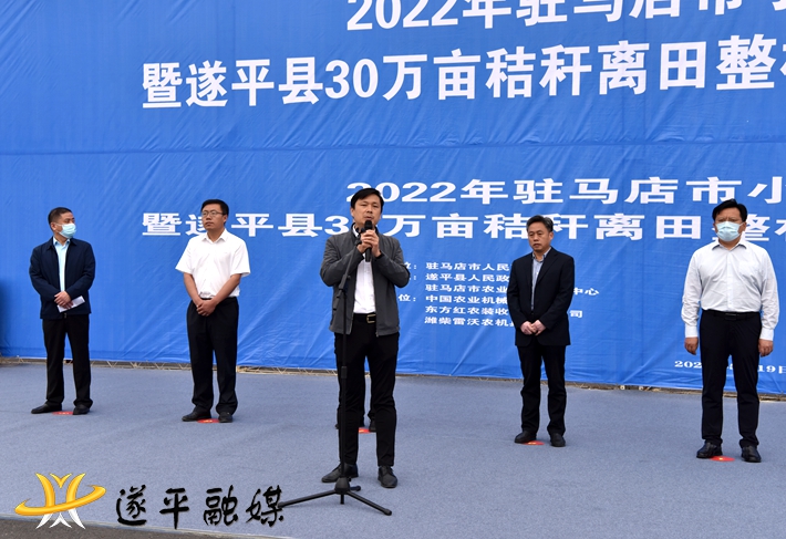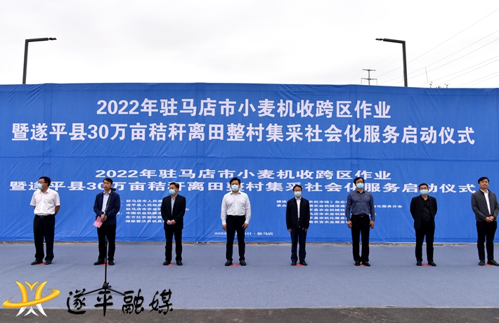 本网讯(记者:晋鑫 张源)5月19日上午,2022驻马店市小麦机收跨区作业暨遂平县30万亩秸秆离田整村集采社会化服务启动仪式在我县举行。市政府副秘书长贾守峰、市农机中心主任鲍秋仁、市农业农村局副局长史迎春、县政府副县长冯浩、中国一拖收获机具公司党委书记田朝阳等出席启动仪式。市农业农村局、市农机技术中心; 各乡镇乡镇长、分管副职、农业服务中心主任;县政府相关部门主要负责同志;部分社会化服务组织和参加跨区作业的农机手代表参加启动仪式。