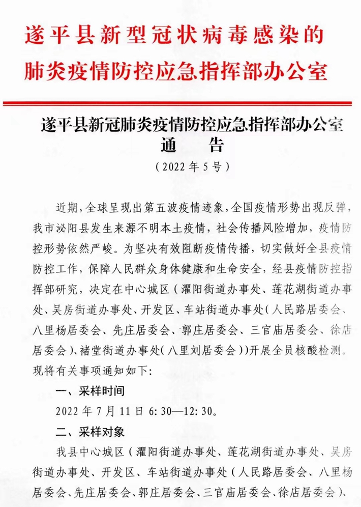 近期,全球呈现出第五波疫情迹象,全国疫情形势出现反弹,我市泌阳县发生来源不明本土疫情,社会传播风险增加,疫情防控形势依然严峻。为坚决有效阻断疫情传播,切实做好全县疫情防控工作,保障人民群众身体健康和生命安全,经县疫情防控指挥部研究,决定在中心城区(灈阳街道办事处、莲花湖街道办事处、吴房街道办事处、开发区、车站街道办事处(人民路居委会、八里杨居委会、先庄居委会、郭庄居委会、三官庙居委会、徐店居委会)、褚堂街道办事处(八里刘居委会))开展全员核酸检测。现将有关事项通知如下: