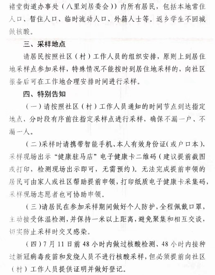 (四)7月11日前48小时内做过核酸检测、48小时内接种过新冠病毒疫苗和发烧人员不进行核酸采样,但必须提前向社区(村)工作人员提供证明并做好登记。