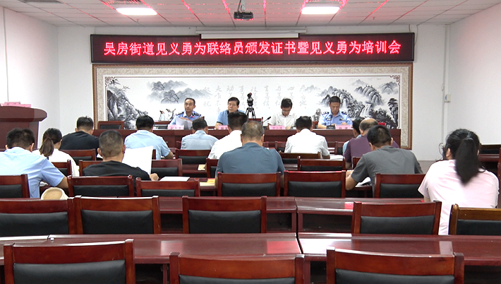 为进一步弘扬见义勇为精神、发展见义勇为事业,切实提高乡镇见义勇为工作站和村级联络员的见义勇为履职能力,8月25日上午,吴房街道见义勇为联络员颁发证书暨见义勇为培训会召开。吴房街道党工委副书记钟江涛、县见义勇为协会副理事长魏满堂、县公安局政办室主任赵书显、吴房街道副主任、派出所所长杨健出席会议。
