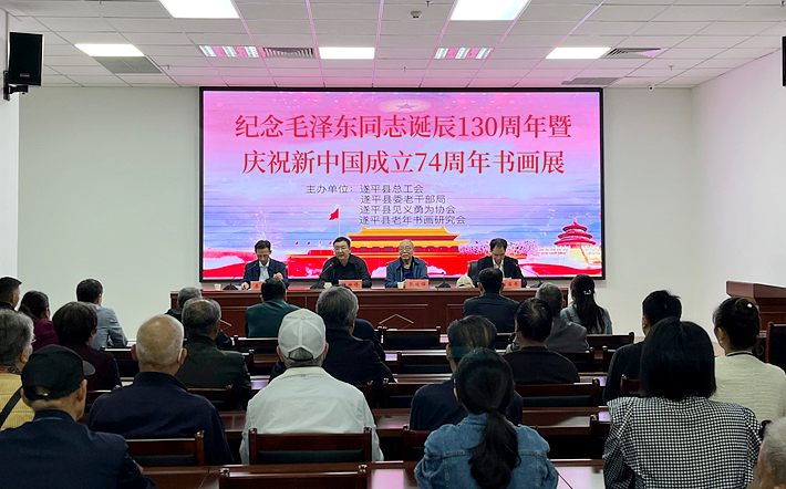 魏世锋在致辞中指出,此次书画展作品内容健康积极向上,作品形式百花齐放,是纪念毛泽东同志诞辰130周年和庆祝中华人民共国和成立74周年的一份厚礼,是各位参展艺术家以画传情,向广大书画爱好者奉上的一份文化厚礼,也为全县书画家们搭建展示才华、互相交流技艺的舞台。各位老干部、老同志是党的事业和遂平发展的亲历者、参与者和见证者。希望通过本次书画展览活动,进一步激发全县老年艺术家们的奉献热情,用手中的画笔讲好遂平故事,用心、精心、倾心创作更多的精品力作,以更加昂扬的精神风貌、健康向上的阳光心态为我县高质量发展献智出力。
