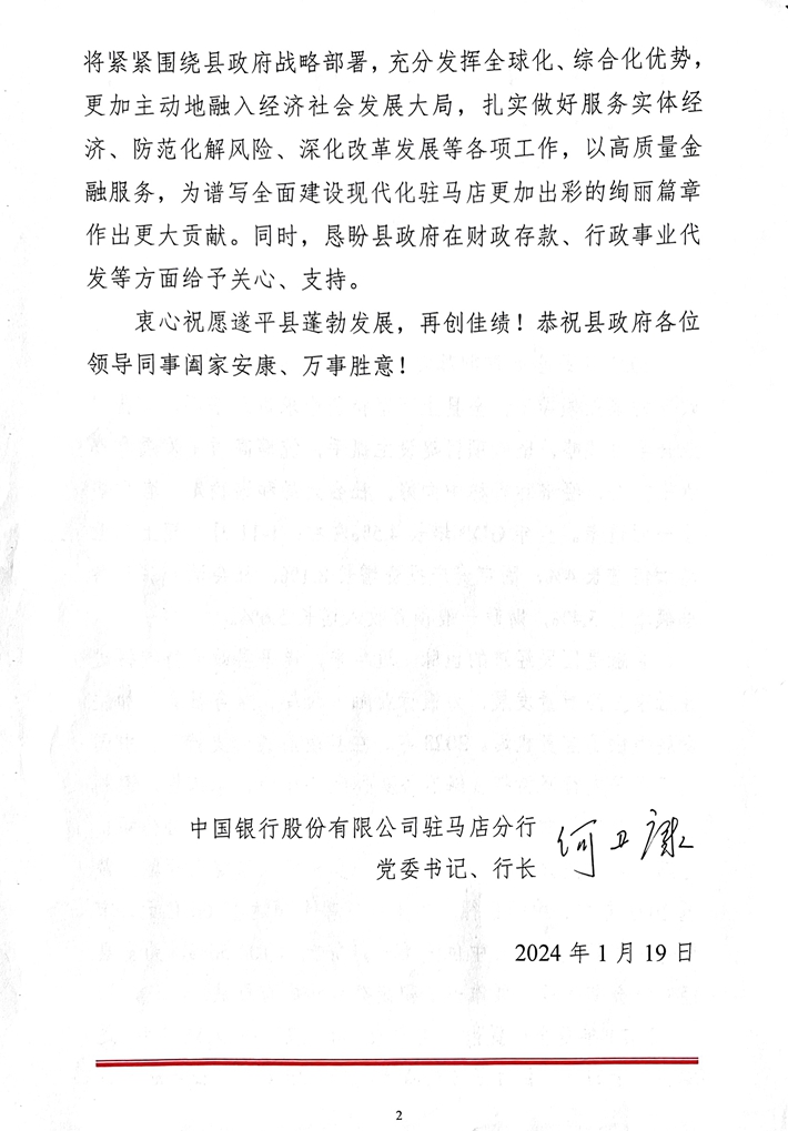 点赞!遂平县人民政府收到中国银行驻马店分行感谢信