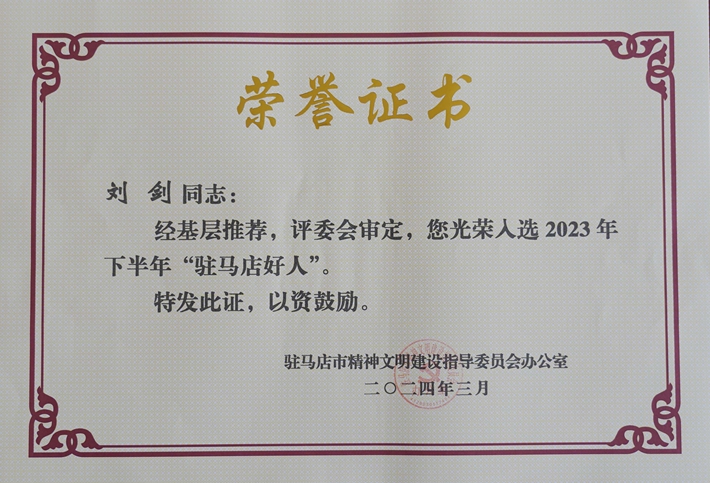 “您敬业奉献精神很值得我们大家学习,您是我们遂平县的骄傲,希望您保重身体”....。“谢谢你们,我会继续努力的,感谢党和政府给我这么高的荣誉”,接过遂平县委宣传部副部长杨春生送交的“驻马店好人”的荣誉证书时,刘剑激动地说。