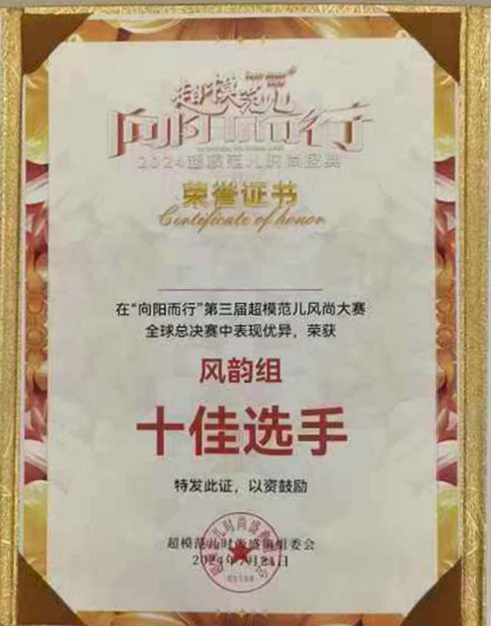 日前,在“向阳而行”中国厦门第三届超模范儿风尚大赛全球总决赛的舞台上,来自遂平县老体协体育模特专委会的王振晶以其出色的表现,成功荣获风韵组“十佳选手”殊荣。