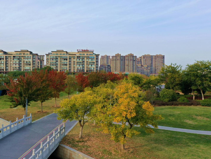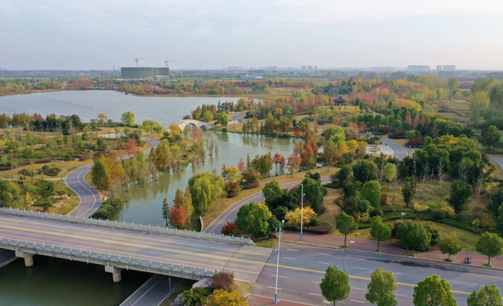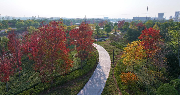 2024年11月17日,在河南省驻马店市遂平县玉湖公园、玉带河公园、汝河公园,记者看到公园内的乌桕、枫香等彩叶林木伴随着冷空气的到来,树叶逐渐凋落,但是仍然呈现出五彩缤纷的绚烂景色,为冬日的小城增添了朦胧、浪漫和诗意的感觉。