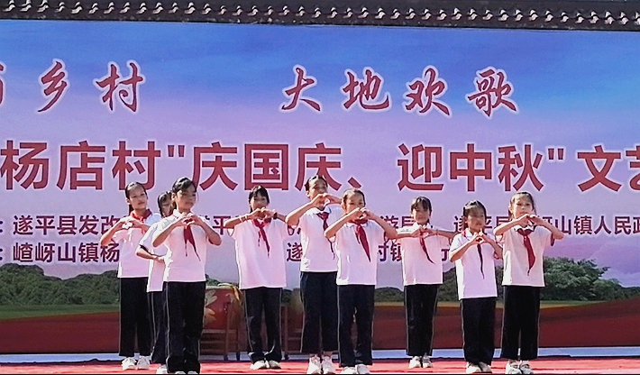 为营造欢乐喜庆、文明和谐的节日氛围,弘扬中华民族优秀的传统文化,激发群众爱国热情,9月30日上午,嵖岈山镇杨店村举行“庆国庆、迎中秋”文艺汇演,用乡土味十足的歌舞、鼓乐,奏响国庆中秋双节家国同庆的欢腾乐章。