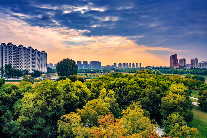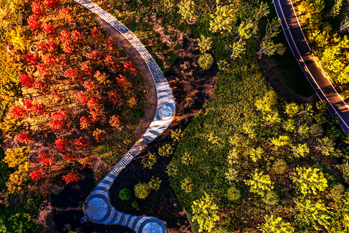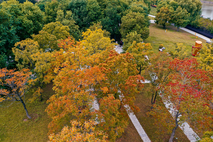 2025年10月10日,河南省驻马店市遂平县汝河公园,一河碧水与两岸色彩斑斓的树木相映成景,处处都被秋色浸染,锦绣交织,风景秀美。图为秋色漫染。赵建明 摄