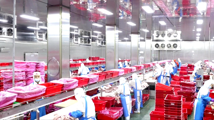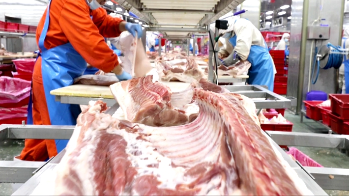 驻马店大红门肉类食品有限公司综合部负责人陈刚:临近春节,市场对猪肉的需求进入高峰,我们不仅增加抽检频次,确保出厂产品100%合格,更开足马力满负荷生产,依托每小时 600 头的屠宰线和全程冷链物流,保障日均 5000 头的屠宰量稳定供应。