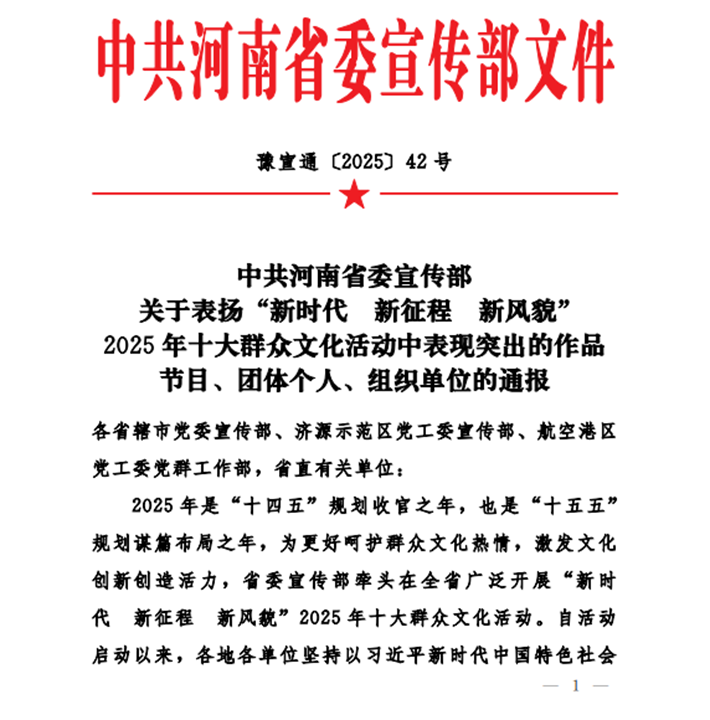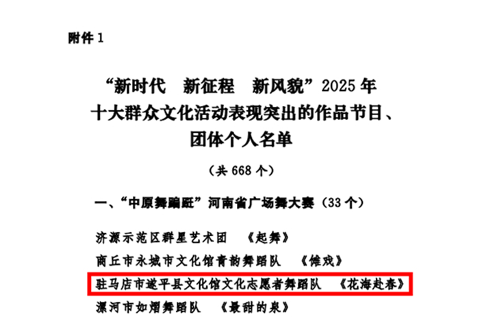近日,由中共河南省委宣传部主办的"新时代 新征程 新风貌"2025年全省十大群众文化活动评选结果正式揭晓,我县文化馆志愿者舞蹈队在“中原舞蹁跹”河南省广场舞大赛中成绩突出,获得省委宣传部通报表彰,据悉,他们已多次代表驻马店市参加该项省级赛事。
