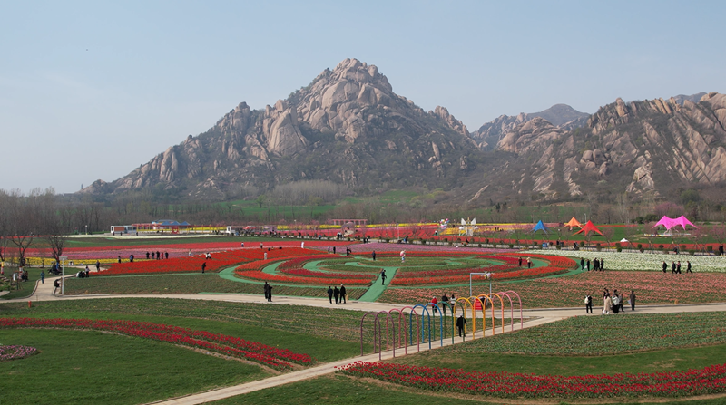 郁金香主题花海位于嵖岈山脚下,与嵖岈山交相辉映。由正门而入,一幅色彩缤纷的春日画卷跃然眼前。赤红、明黄、雪白、绛紫、嫩黄、粉红……花海经过精心布局,将各种颜色巧妙编织。深色系热烈奔放,浅色系温婉雅致,整个园区分割成不同的色块、色带,如同彩虹坠落人间,配上蓝天白云、远山绿树,随手一拍都是一张大片。