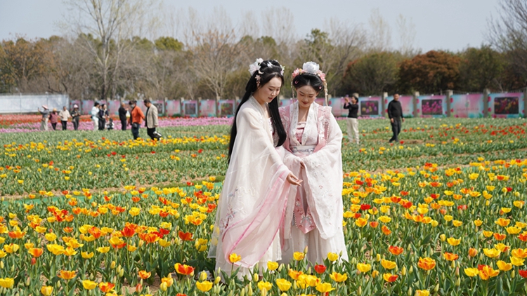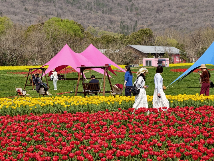 游客在花海中穿梭、观赏、拍照留念,欢声笑语在园区回荡。郁金香的盛开不仅为遂平增添了一道亮丽的风景线,也吸引了周边地区的人们前来感受这春天的美好和视觉的享受。
