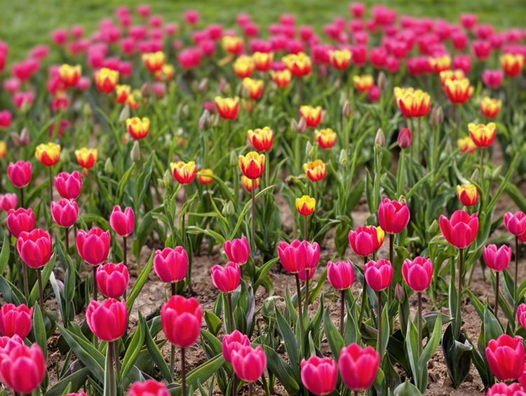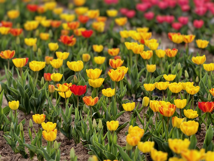 在郁金香主题花海花卉种植区,一朵朵郁金香娇艳欲滴,红的似火、粉的如霞、黄的若金,它们在微风中轻轻摇曳,仿佛在向人们展示着最美的姿态。
