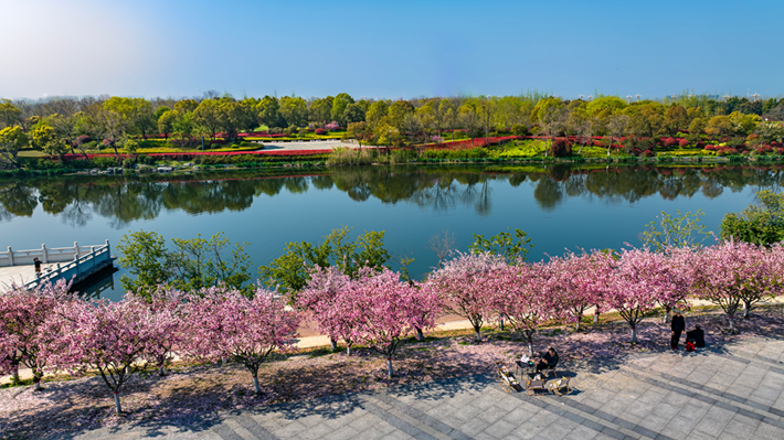 2026年4月2日,河南省驻马店市遂平县玉带河畔,碧水映着蓝天,两岸柳丝垂绿,繁花吐艳,一步一景,尽是盎然生机。图为春染长河。赵建明 摄