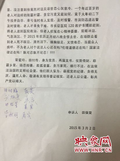 上图:多名村民联合签名,反映95岁五保老人田保兴跳井事件