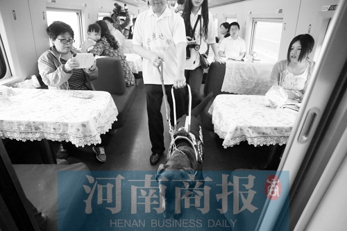 导盲犬凯西、戴安娜、A米第一次坐上了高铁,它们要带着主人李国富、李伟和王蕾前往洛阳“看”牡丹。